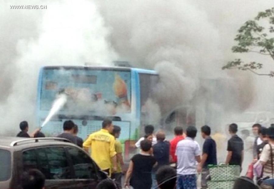 Photo taken by a mobile phone shows smokes rising from a burning bus in Hangzhou, capital of east China's Zhejiang Province, July 5, 2014. Witnesses say some people aboard were injured and sent to hospital. Local police is investigating on the spot and the reason of the fire is still unknown. There was no death report yet. (Xinhua)