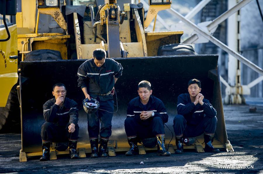 Rescuers wait outside an entrance of the pit where a gas blast traps 17 miners at the No. 1 coal pit of Dhuangshan Yunxin Coal Mining Co., Ltd, in Fukang City, northwest China's Xinjiang Uygur Autonomous Region, July 6, 2014. The blast happened at 8:43 p.m. on Saturday, when 20 people were working inside the mine. Three of them have been rescued. Rescuers are pouring nitrogen into the mine to dilute the gas concentration. The process, which was started early on Sunday morning, needs to be continued for 24 hours before it is safe to enter the pit, said rescuers. (Xinhua/Jiang Wenyao)
