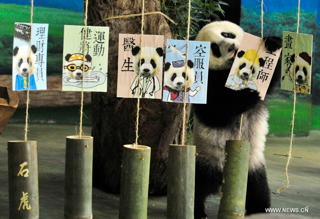 Giant panda "Yuanzai"grabs future card on its first birthday at the Taipei Zoo inTaipei, southeast China's Taiwan, July 6, 2014. (Xinhua/WuChing-teng)