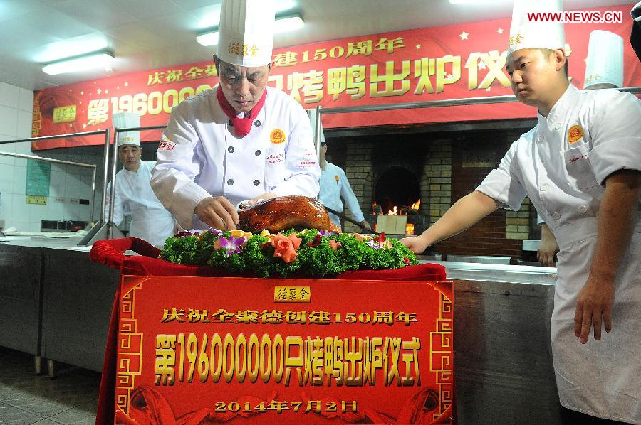 Head chef Zheng Zhiqiang places Quanjude's 196 millionth roast duck on a plate during a ceremony for the 150th anniversary of Quanjude Beijing Roast Duck Restaurant at its Qianmen Branch in Beijing, capital of China, July 2, 2014. (Xinhua/Zhang Yan)