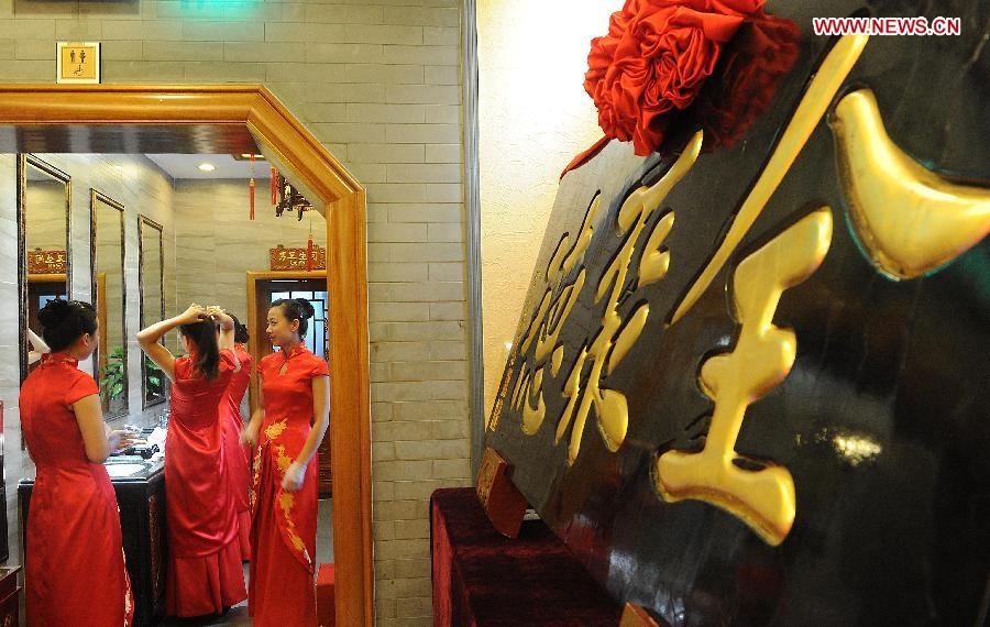 Waitresses prepare for a ceremony for the 150th anniversary of Quanjude Beijing Roast Duck Restaurant at its Qianmen Branch in Beijing, capital of China, July 2, 2014. (Xinhua/Zhang Yan)