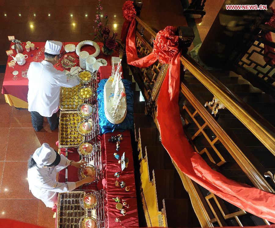 Staff members are busy arranging showcase for a ceremony for the 150th anniversary of Quanjude Beijing Roast Duck Restaurant at its Qianmen Branch in Beijing, capital of China, July 2, 2014. (Xinhua/Zhang Yan)