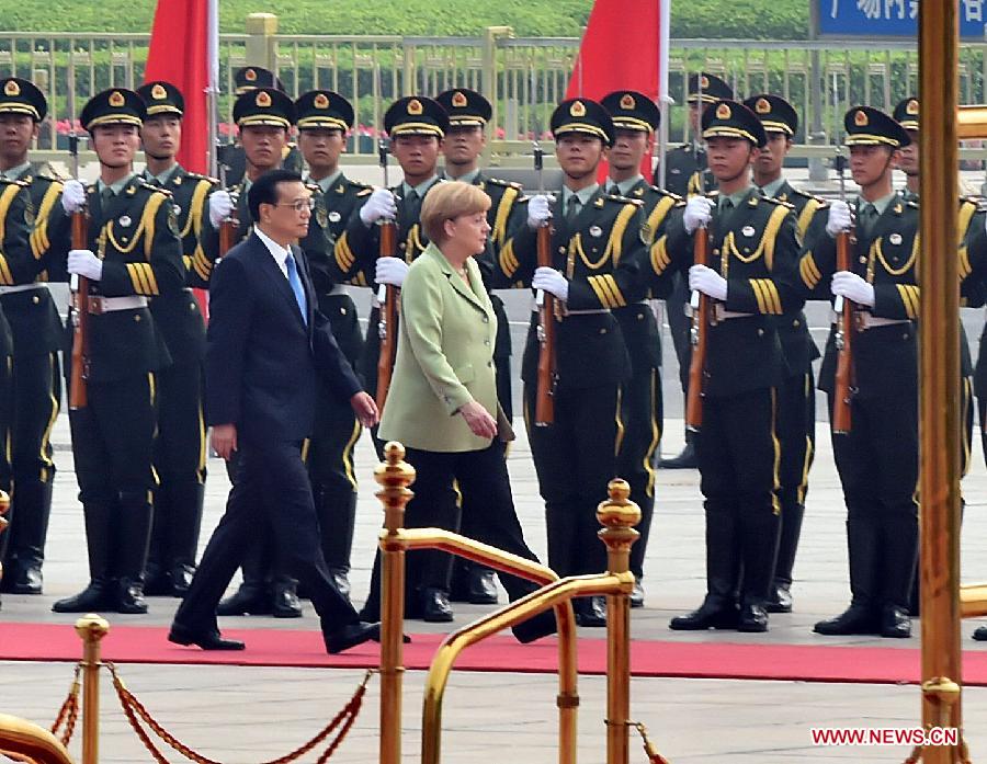 Chinese Premier Li Keqiang (front, L) holds a welcoming ceremony for visiting German Chancellor Angela Merkel in Beijing, capital of China, July 7, 2014. (Xinhua/Li Tao)