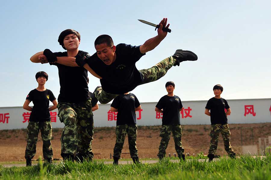 Since summer, the women special assault team of the Frontier Corps of Armed Police in Xinjiang has been conducting high-intensity training. Every day, they finish basic physic training including 5 km cross-country running carrying a load of 20 kilograms, pulling tires and carrying logs. They also conduct exercise such as climbing and shooting. (Xinhua Photo)