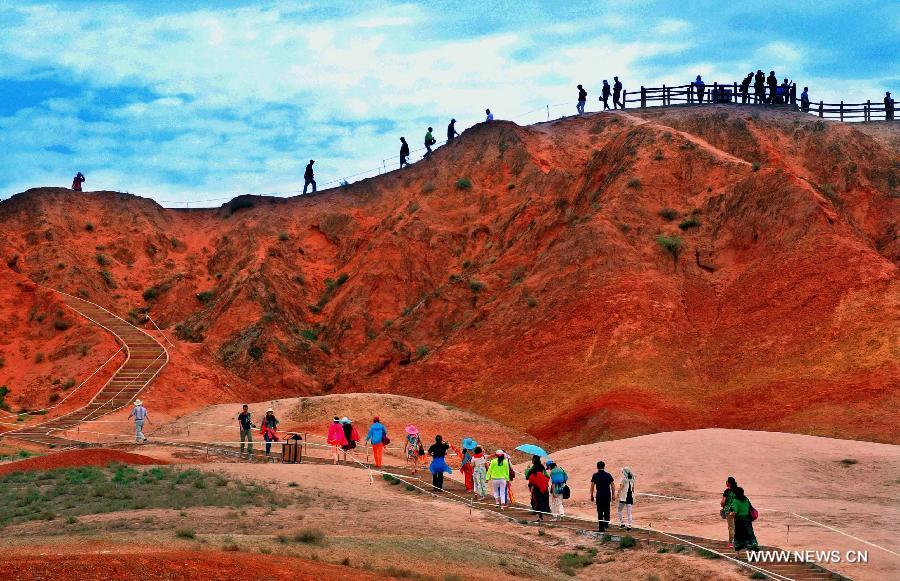 | Photo taken on July 7, 2014 shows the scenery at Zhangye Danxia Landform Geological Park in Zhangye City, northwest China's Gansu Province. Danxia, which means "rosy cloud", is a special landform formed from reddish sandstone that has been eroded over time into a series of mountains surrounded by curvaceous cliffs and many unusual rock formations. (Xinhua/Wang Song) |