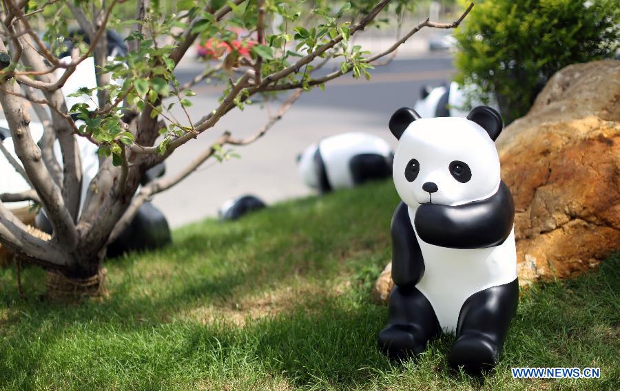 | A panda figure is displayed during the open-air show "1st Panda" in Shenyang, capital of northeast China's Liaoning Province, July 7, 2014. A hundred panda figures made from bamboo scraps are shown during the event, which aims at promoting environmental awareness. (Xinhua/Yao Jianfeng) |