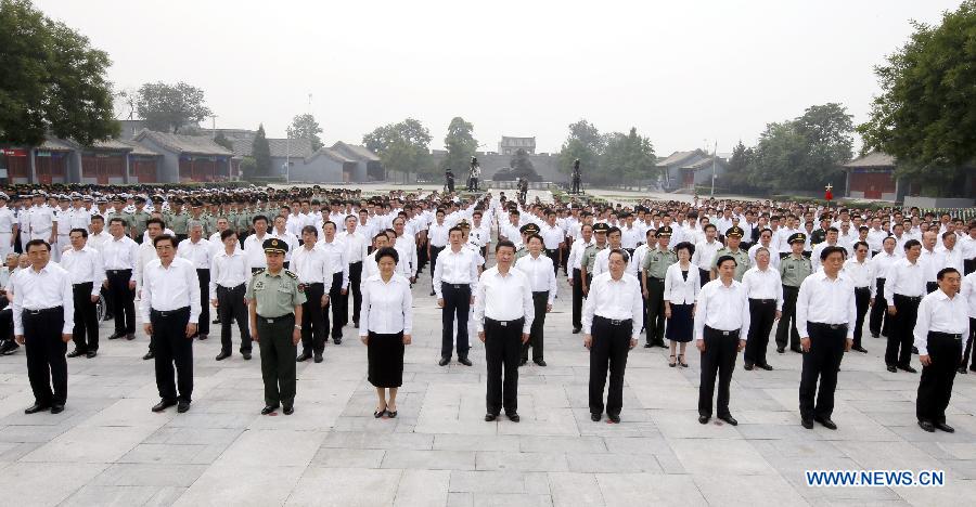 Chinese leaders Xi Jinping (C, front) and Yu Zhengsheng (4th R, front) take part in a grand gathering marking the 77th anniversary of the start of the Chinese people's war of resistance against Japanese invasion in Beijing, capital of China, July 7, 2014. (Xinhua/Ju Peng)