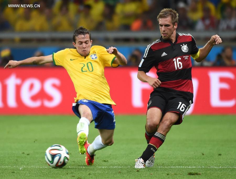Brazil's Bernard vies with Germany's Philipp Lahm during a semifinal match between Brazil and Germany of 2014 FIFA World Cup at the Estadio Mineirao Stadium in Belo Horizonte, Brazil, on July 8, 2014.(Xinhua/Li Ga)