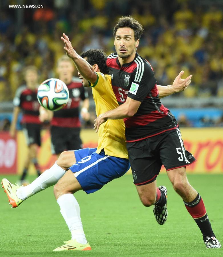 Germany's Mats Hummels (R) vies with Brazil's Fred during a semifinal match between Brazil and Germany of 2014 FIFA World Cup at the Estadio Mineirao Stadium in Belo Horizonte, Brazil, on July 8, 2014.(Xinhua/Liu Dawei)