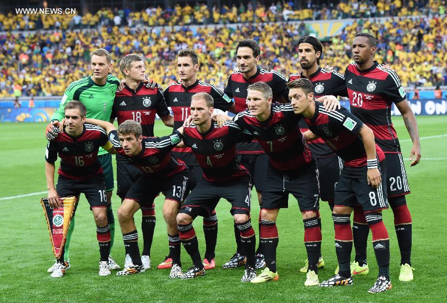 Germany's players pose for a group photo before a semifinal match between Brazil and Germany of 2014 FIFA World Cup at the Estadio Mineirao Stadium in Belo Horizonte, Brazil, on July 8, 2014.(Xinhua/Liu Dawei)