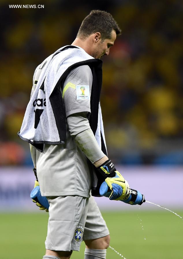 Brazil's goalkeeper Julio Cesar (L) leaves the field at the end of the first half during a semifinal match between Brazil and Germany of 2014 FIFA World Cup at the Estadio Mineirao Stadium in Belo Horizonte, Brazil, on July 8, 2014.(Xinhua/Qi Heng)