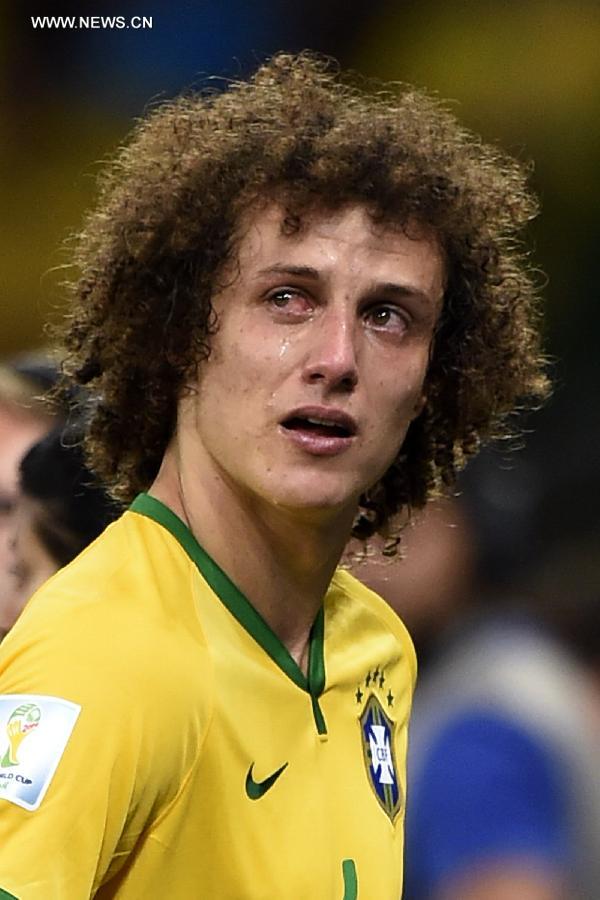 Brazil's David Luiz looks on with tears after a semifinal match between Brazil and Germany of 2014 FIFA World Cup at the Estadio Mineirao Stadium in Belo Horizonte, Brazil, on July 8, 2014. Germany won 7-1 over Brazil and qualified for the final on Tuesday. (Xinhua/Qi Heng)