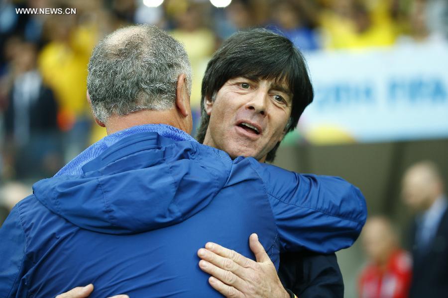Brazil's coach Luiz Felipe Scolari (L) greets Germany's coach Joachim Loew before a semifinal match between Brazil and Germany of 2014 FIFA World Cup at the Estadio Mineirao Stadium in Belo Horizonte, Brazil, on July 8, 2014.(Xinhua/Chen Jianli)