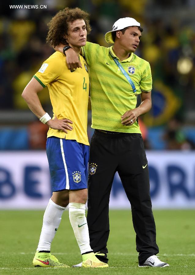 Brazil's David Luiz (L) is consoled by Thiago Silva after a semifinal match between Brazil and Germany of 2014 FIFA World Cup at the Estadio Mineirao Stadium in Belo Horizonte, Brazil, on July 8, 2014. Germany won 7-1 over Brazil and qualified for the final on Tuesday. (Xinhua/Qi Heng)