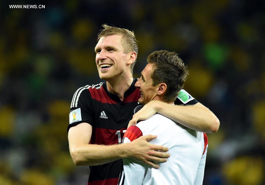 Germany's Per Mertesacker (L) and Miroslav Klose celebrate their victory after a semifinal match between Brazil and Germany of 2014 FIFA World Cup at the Estadio Mineirao Stadium in Belo Horizonte, Brazil, on July 8, 2014. Germany won 7-1 over Brazil and qualified for the final on Tuesday. (Xinhua/Liu Dawei)