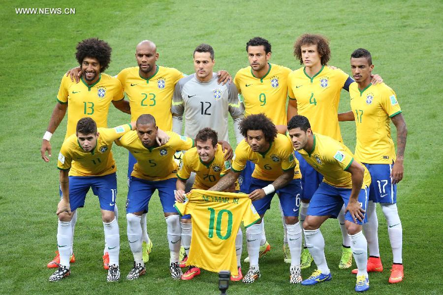 Brazil's players pose for a group photo during a semifinal match between Brazil and Germany of 2014 FIFA World Cup at the Estadio Mineirao Stadium in Belo Horizonte, Brazil, on July 8, 2014.(Xinhua/Li Ming)