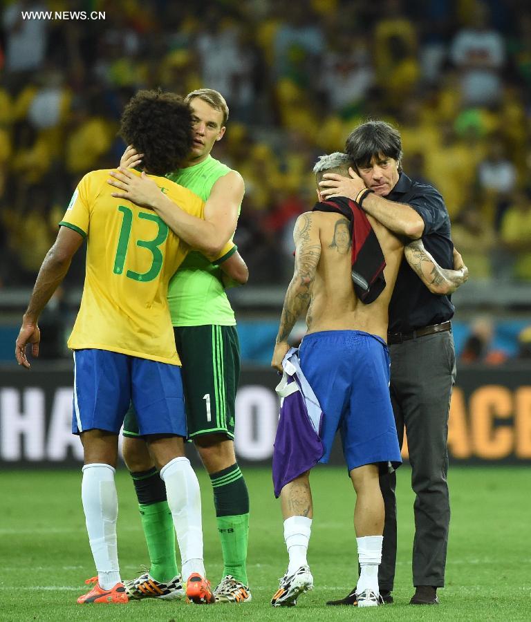 Germany's coach Joachim Loew (1st R) and goalkeeper Manuel Neuer (2nd L) greet Brazil's Dante (1st L) after a semifinal match between Brazil and Germany of 2014 FIFA World Cup at the Estadio Mineirao Stadium in Belo Horizonte, Brazil, on July 8, 2014. Germany won 7-1 over Brazil and qualified for the final on Tuesday. (Xinhua/Liu Dawei)