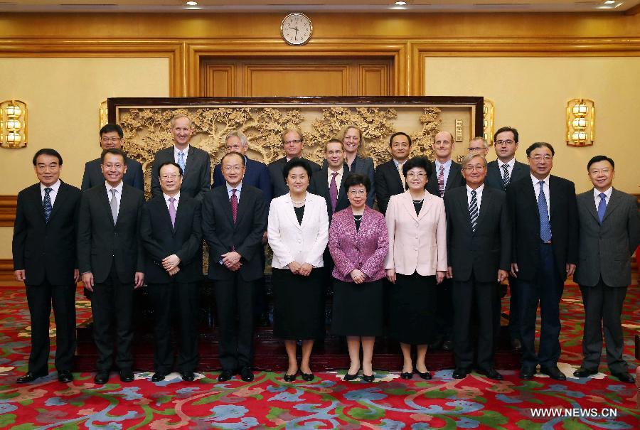 Chinese Vice Premier Liu Yandong (5th L, front) meets with Margaret Chan (5th R, front), director-general of the World Health Organization (WHO), and World Bank President Jim Yong Kim (4th L, front) in Beijing, capital of China, July 8, 2014. (Xinhua/Liu Weibing)