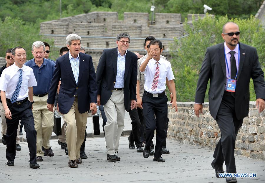 U.S. Secretary of State John Kerry (3rd L) and Secretary of the Treasury Jacob Lew (4th L) pay a visit to the Badaling Great Wall in Beijing, capital of China, July 8, 2014. Kerry and Lew visited the Badaling Great Wall on Tuesday, along with U.S. Ambassador to China Max Baucus (2nd L). Kerry and Lew are in Beijing for the upcoming sixth China-U.S. Strategic and Economic Dialogue (S&ED), to be held in Beijing on July 9 and 10. (Xinhua/Li Xin)