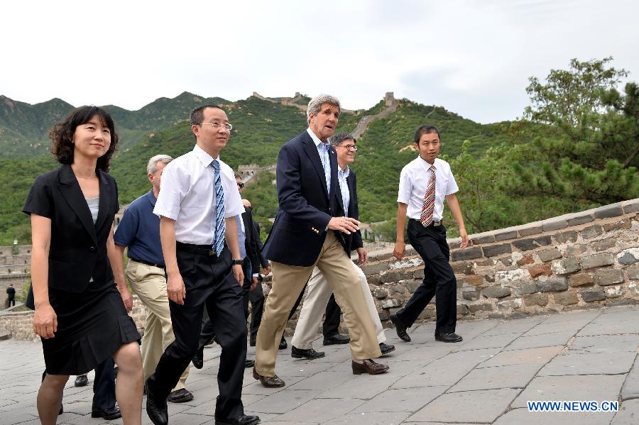 | U.S. Secretary of State John Kerry (3rd R) and Secretary of the Treasury Jacob Lew (2nd R) pay a visit to the Badaling Great Wall in Beijing, capital of China, July 8, 2014. Kerry and Lew visited the Badaling Great Wall on Tuesday, along with U.S. Ambassador to China Max Baucus. Kerry and Lew are in Beijing for the upcoming sixth China-U.S. Strategic and Economic Dialogue (S&ED), to be held in Beijing on July 9 and 10. (Xinhua/Li Xin) |