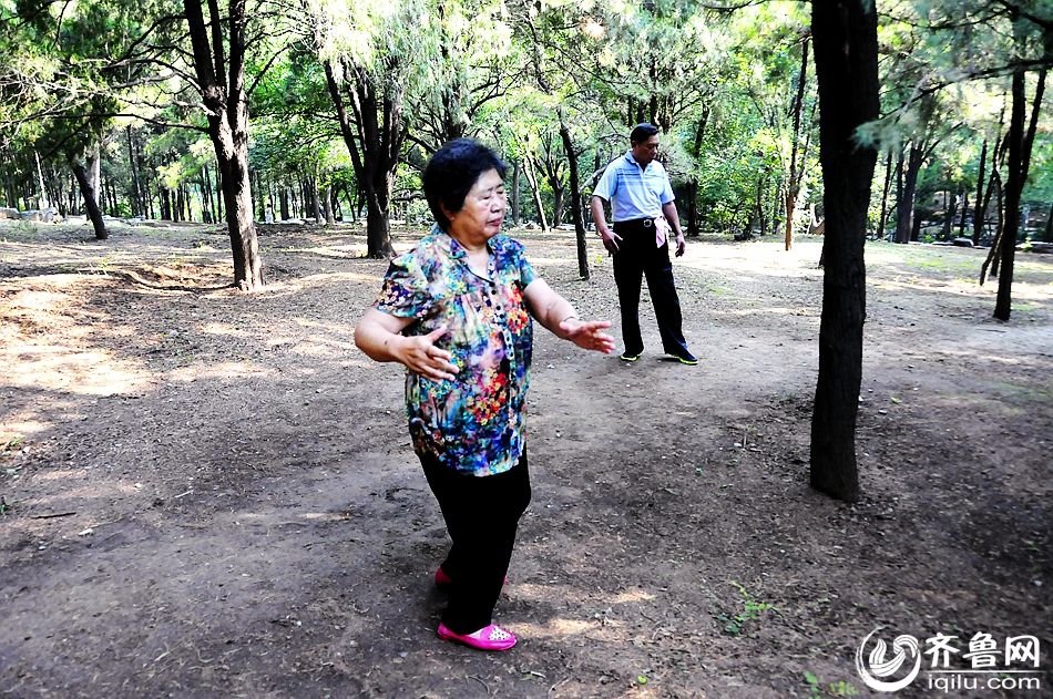 Li, 75, does excises in the park, while her 74-year-old husband does another breathing exercises aside. (Photo/iqilu.com)