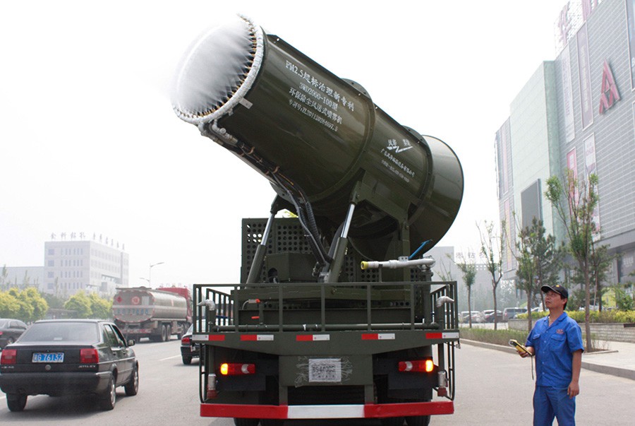 A multi-function vehicle spays water to decrease dust and moisten the air in Xuanhua District, Zhangjiakou, Hebei province on July 7, 2014. (Xinhua/ Chen Xiaodong)