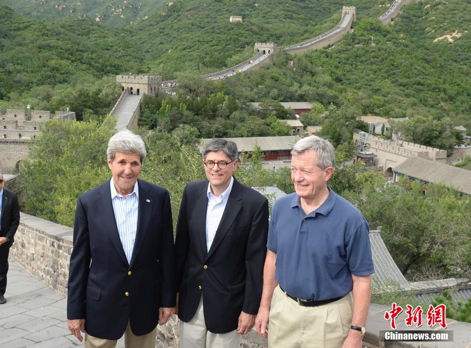 U.S. Secretary of State John Kerry (L) and U.S. Treasury Secretary Jacob Lew (M) visit Badaling Great Wall in Beijing, July 8. They are accompanied by U.S. ambassador to China Max Baucus (R). (CNS/Hou Yu)