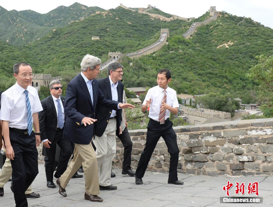| U.S. Secretary of State John Kerry (L2) and U.S. Treasury Secretary Jacob Lew (R2) visit Badaling Great Wall in Beijing, July 8. (CNS/Hou Yu) |