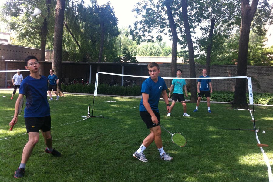 The Danish Badminton Inspiration Team plays a friendly match with Chinese social media users on the outdoor badminton courts at the Danish Embassy in Beijing July 8, 2014. (Photo/People’s Daily Online)