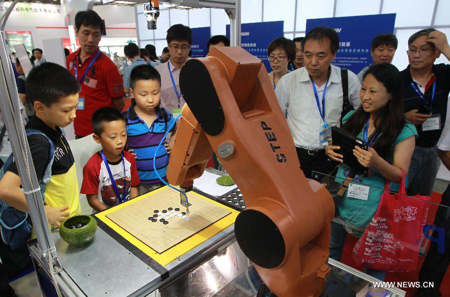 | A boy plays gobang against a robot during the China International Robot Show in east China's Shanghai, July 9, 2014. The three-day show kicked off on Wednesday, demonstrating latest achievements in the robot industry. (Xinhua/Pei Xin) |