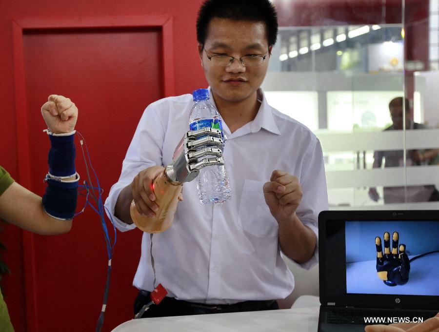 An exhibitor demonstrates how to use a robot hand to catch things during the China International Robot Show in east China's Shanghai, July 9, 2014. The three-day show kicked off on Wednesday, demonstrating latest achievements in the robot industry. (Xinhua/Ding Ting)