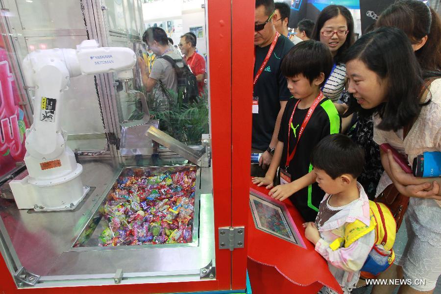 Visitors play a prize claw for candies during the China International Robot Show in east China's Shanghai, July 9, 2014. The three-day show kicked off on Wednesday, demonstrating latest achievements in the robot industry. (Xinhua/Pei Xin)