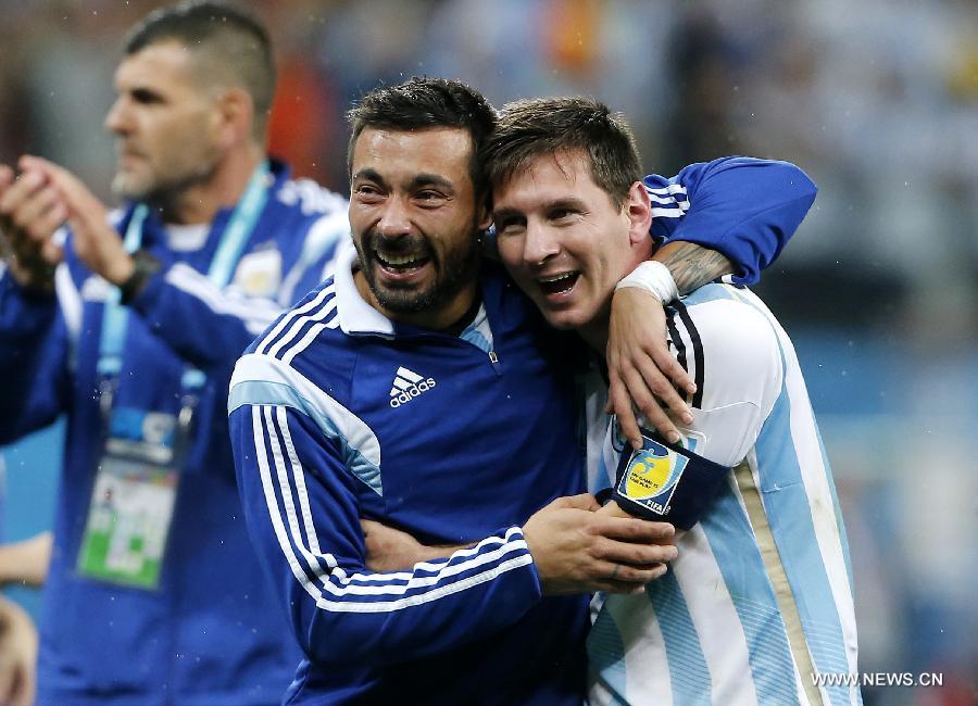 | Argentina's Lionel Messi (R) and Ezequiel Lavezzi (C) celebrate their victory after a semifinal match between Netherlands and Argentina of 2014 FIFA World Cup at the Arena de Sao Paulo Stadium in Sao Paulo, Brazil, on July 9, 2014. Argentina won 4-2 on penalties over Netherlands after a 0-0 tie and qualified for the final on Wednesday. (Xinhua/Zhou Lei) |