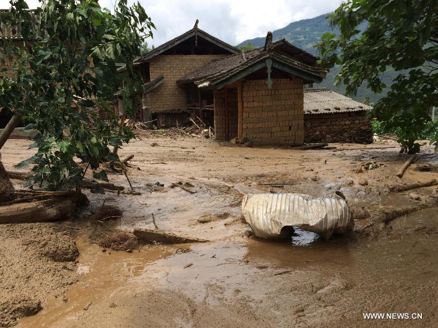 Photo taken on July 10, 2014 shows the site after a rain-triggered landslide hit Gelan Village of Shangri-La County in Diqing Prefecture, southwest China's Yunnan Province. Two people went missing and three others injured in the landslide which occurred on early Thursday morning. (Xinhua/Luo Xiaoguang)