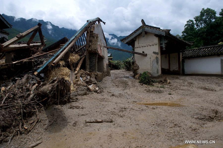 | Photo taken on July 10, 2014 shows the site after a rain-triggered landslide hit Gelan Village of Shangri-La County in Diqing Prefecture, southwest China's Yunnan Province. Two people went missing and three others injured in the landslide which occurred on early Thursday morning. (Xinhua/Luo Xiaoguang) |
