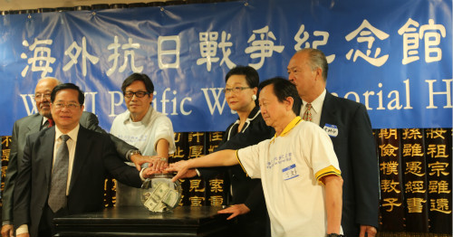 | Yuan Nansheng (first, left), consul general of China in San Francisco, Florence Fang (fourth, left), curator of the WWII Pacific War Memorial Hall James Whitehead, chairman of Flying Tigers Historical Organization (second, left) and others announce the launch of the buildup of the WWII Pacific War Memorial Hall. (People’s Daily Online/Han Shasha) |