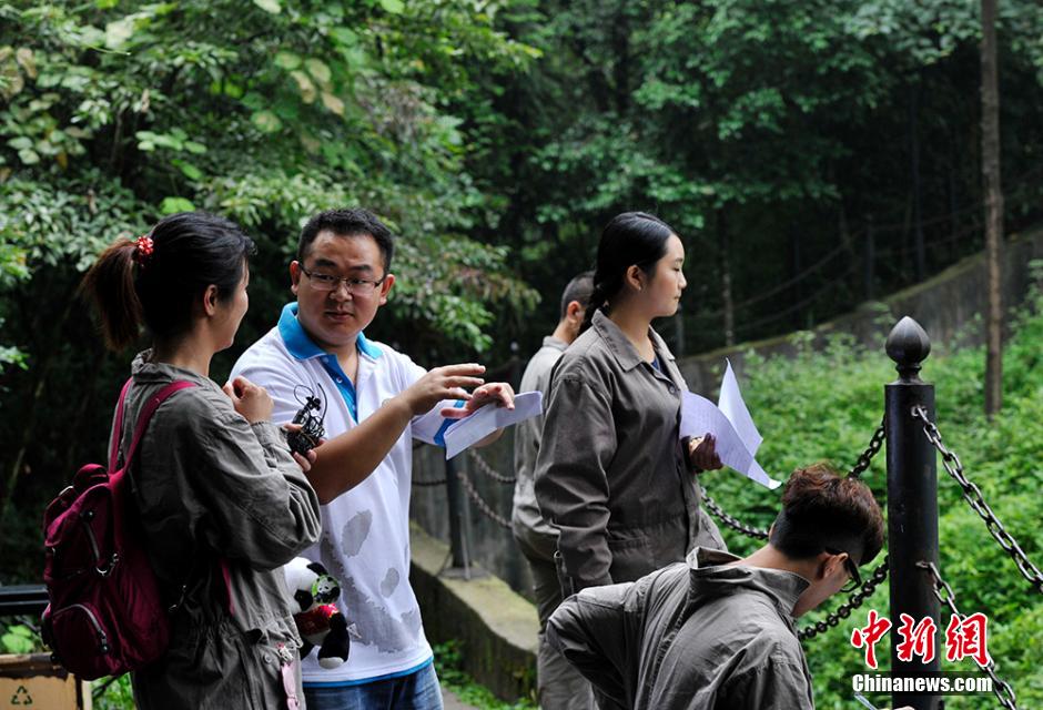 Twelve university students from Taiwan and Sichuan provinces arrive at Ya'an Bifengxia Breeding Base of the China Giant Panda Protection and Research Center, home town of the first Taiwan-born panda Yuan Zai on July 7, 2014. They cleaned the pandas' house, prepared milk and fed the giant pandas and recorded the rhythm of pandas' body movements. ( Chinanews.com/ Li Huajun)