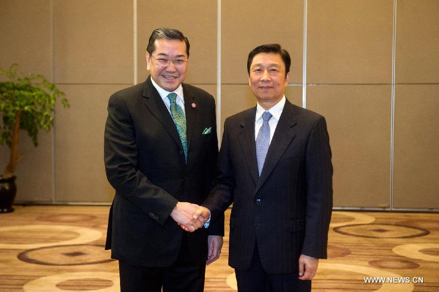 Chinese Vice President Li Yuanchao (R) meets with former Thai Deputy Prime Minister Surakiat Sathirathai who came to China to attend the Eco Forum Global Annual Conference 2014 in Guiyang, capital city of southwest China's Guizhou Province, July 10, 2014. (Xinhua/Ou Dongqu)