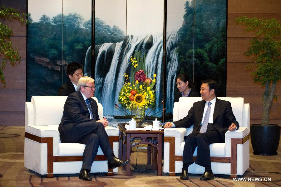 Chinese Vice President Li Yuanchao (R) meets with former Australian Prime Minister Kevin Rudd who came to China to attend the Eco Forum Global Annual Conference 2014 in Guiyang, capital of southwest China's Guizhou Province, July 10, 2014. (Xinhua/Ou Dongqu)