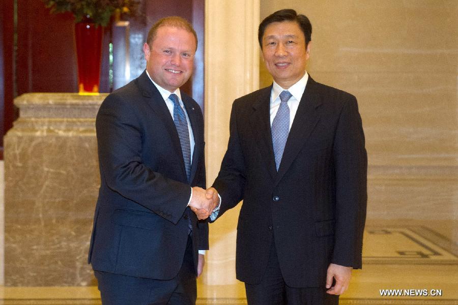 Chinese Vice President Li Yuanchao (R) meets with Malta's Prime Minister Joseph Muscat who came to China to attend the Eco Forum Global Annual Conference 2014 in Guiyang, capital of southwest China's Guizhou Province, July 10, 2014. (Xinhua/Ou Dongqu)