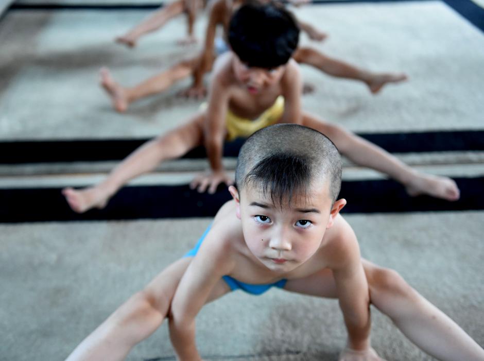 Children receive training under the guidance of the coach during the summer vacation in Bozhou City, east China's Anhui Province, July 9, 2013. Some parents sent their children to receive gymnastics training in summer, hoping that the children will have a better physical condition and a rich vacation life. (Photo/CNS)