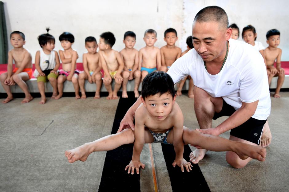 Children receive training under the guidance of the coach during the summer vacation in Bozhou City, east China's Anhui Province, July 9, 2013. Some parents sent their children to receive gymnastics training in summer, hoping that the children will have a better physical condition and a rich vacation life. (Photo/CNS)