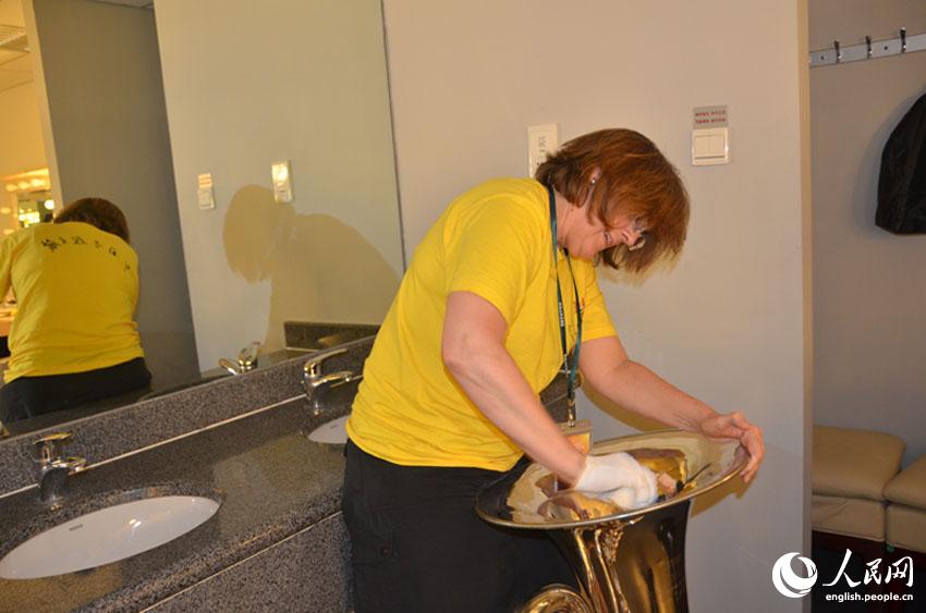 A member of the Australian New Goldberg Orchestra wipes the instrument in the dressing room of the National Grand Theatre in Beijing, July 8, 2014. (People's Daily Online/Du Mingming)