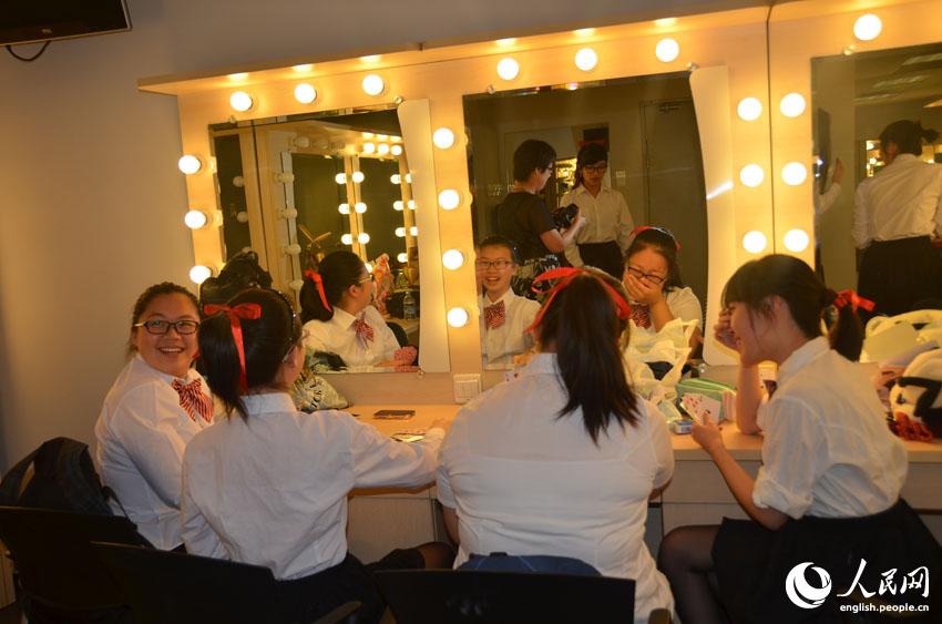 Members of the Australian New Goldberg Orchestra play poker in the dressing room of the National Grand Theatre in Beijing, July 8, 2014. (People's Daily Online/Du Mingming)