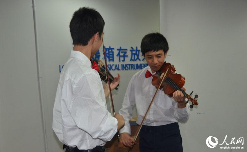 Members of the Australian New Goldberg Orchestra practice in the backstage of the National Grand Theatre in Beijing, July 8, 2014. (People's Daily Online/Du Mingming)