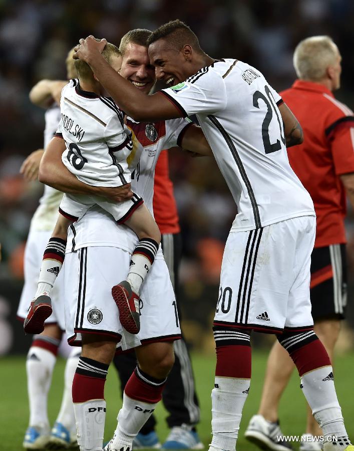 Germany's Lukas Podolski (L) carrying his son celebrates the victory with Jerome Boateng (R) after the final match between Germany and Argentina of 2014 FIFA World Cup at the Estadio do Maracana Stadium in Rio de Janeiro, Brazil, on July 13, 2014. Germany won 1-0 over Argentina after 120 minutes and took its fourth World Cup title on Sunday. (Xinhua/Qi Heng)