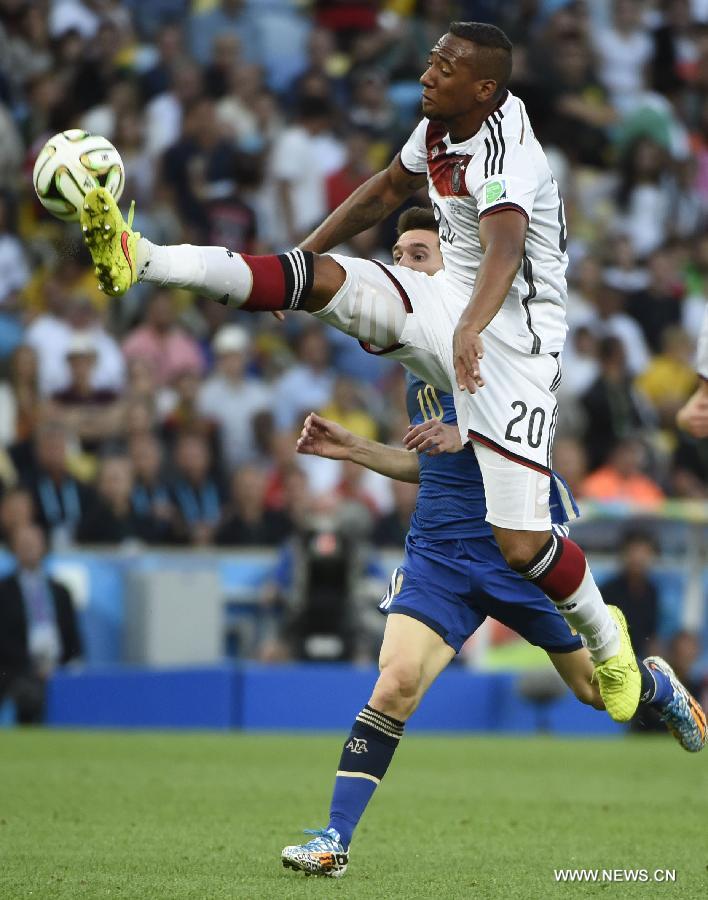 Germany's Jerome Boateng (front) controls the ball against Argentina's Lionel Messi during the final match between Germany and Argentina of 2014 FIFA World Cup at the Estadio do Maracana Stadium in Rio de Janeiro, Brazil, on July 13, 2014. (Xinhua/Yang Lei)