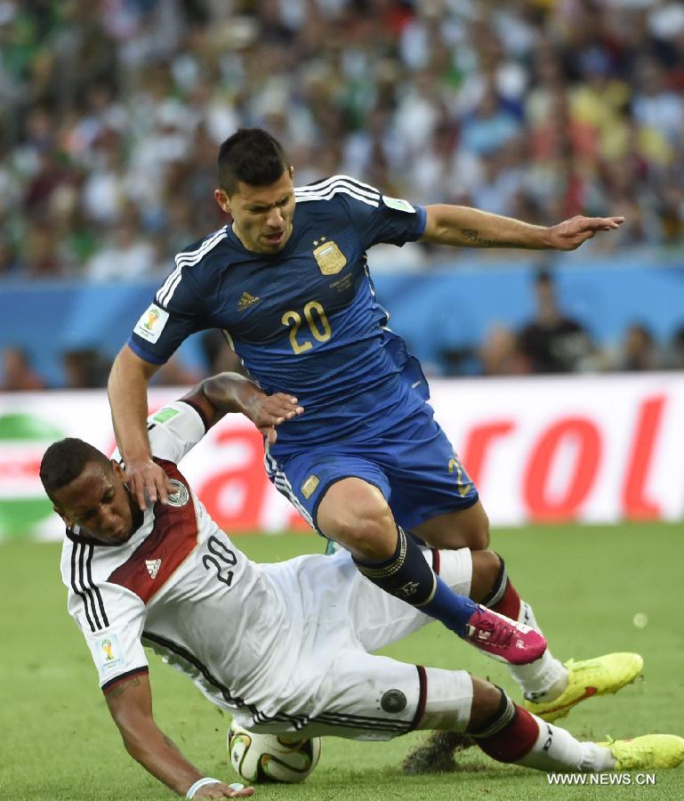 Argentina's Sergio Aguero (R) vies with Germany's Jerome Boateng during the final match between Germany and Argentina of 2014 FIFA World Cup at the Estadio do Maracana Stadium in Rio de Janeiro, Brazil, on July 13, 2014. (Xinhua/Yang Lei)