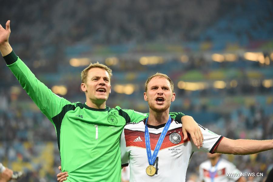 Germany's Benedikt Howedes (R) and goalkeeper Manuel Neuer celebrate their victory after the final match between Germany and Argentina of 2014 FIFA World Cup at the Estadio do Maracana Stadium in Rio de Janeiro, Brazil, on July 13, 2014. Germany won 1-0 over Argentina after 120 minutes and took its fourth World Cup title on Sunday. (Xinhua/Liu Dawei)