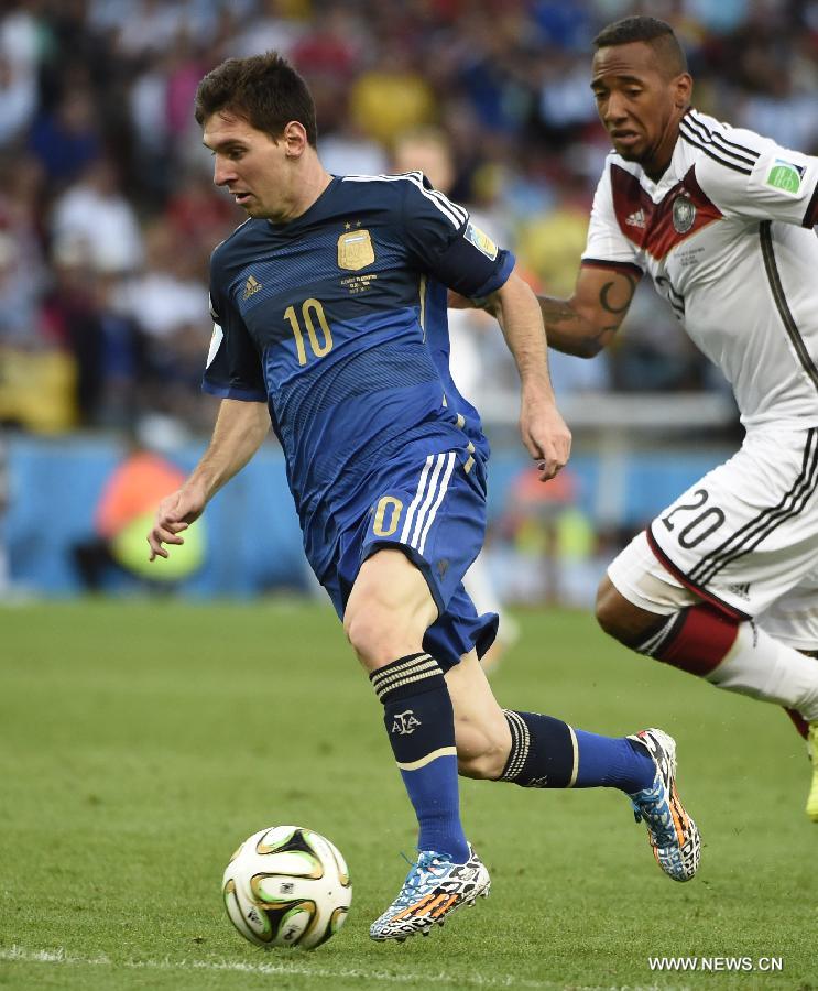 Argentina's Lionel Messi (L) controls the ball during the final match between Germany and Argentina of 2014 FIFA World Cup at the Estadio do Maracana Stadium in Rio de Janeiro, Brazil, on July 13, 2014. (Xinhua/Yang Lei)